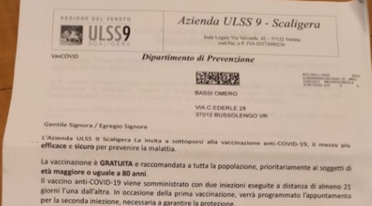 “La invitiamo a effettuare la vaccinazione anti Covid-19 nel giorno ed orario di seguito riportati – 29 marzo, ore 11:01”. Questo si legge nella lettera inviata al signor Omero Bassi, in realtà morto trent’anni fa. È successo a Bussolengo, in provincia di Verona, dove i familiari hanno ricevuto la comunicazione da parte della Ulss 9 Scaligera.