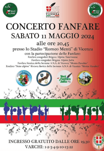 Alla musica e la coreografia delle fanfare è poi dedicato il grande concerto della sera di sabato 11 allo Stadio Menti di Vicenza, nel quale a partire dalle ore 20.45 si esibiranno: