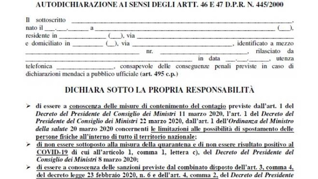 Come nei giorni scorsi, il nuovo modulo si potrà scaricare anche dal sito del Viminale, oppure,  se non si ha la stampante a casa, si potrà anche ricopiare a mano. Il modulo deve essere presentato in caso di controllo. Nel nuovo modulo il dichiarante deve indicare oltre alla residenza anche il domicilio. Nella prima parte, tra i provvedimenti di cui deve dichiarare di essere a conoscenza, ci sono anche il Dpcm del 22 marzo e l’ordinanza del ministero della Salute del 20 marzo “concernenti le limitazioni alle possibilità di spostamento delle persone” nel territorio nazionale. Nel nuovo modulo occorre inoltre indicare da dove lo spostamento è cominciato e la destinazione.