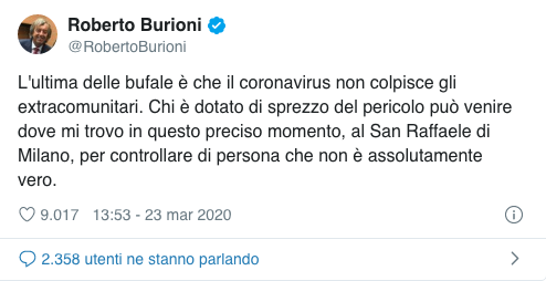 “Fate una verifica e vedrete che in tutti gli ospedali, non c’è un extracomunitario di qualsiasi età positivo o ricoverato per Cov19!!!!!!!!! Come è possibile!?!?!? Solo gli italiani….allora…meditare gente”. E’ questo uno dei post che, negli ultimi giorni gira sui social e che affronta la questione del contagio da coronavirus, relativa alla popolazione straniera presente nel nostro paese. C’è chi parla di migranti vaccinati contro la tubercolosi, che li renderebbe immuni al contagio. Chi, con tono complottista, di un virus che attacca solo gli italiani, perché nelle statistiche non risulterebbero deceduti di nazionalità straniera. A smentire la bufala è intervenuto anche il virologo Roberto Burioni, che in tweet polemico sottolinea: “L’ultima delle bufale è che il coronavirus non colpisce gli extracomunitari. Chi è dotato di sprezzo del pericolo può venire dove mi trovo in questo preciso momento, al San Raffaele di Milano, per controllare di persona che non è assolutamente vero”. In effetti, la questione è molto semplice. Nelle tabelle della Protezione Civile, che riportano il numero dei contagi, dei decessi e dei guariti, non vengono indicate le nazionalità dei pazienti.