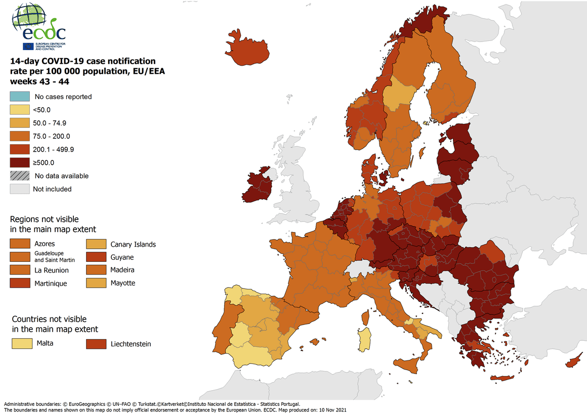 Secondo l’Ecdc, il Centro europeo per il controllo delle malattie, 10 Paesi sono in una situazione “molto preoccupante”: Belgio, Polonia, Olanda, Bulgaria, Croazia, Repubblica Ceca, Estonia, Grecia, Ungheria e Slovenia; altrettanti sono in una situazione “preoccupante”: Germania, Austria, Danimarca, Finlandia, Irlanda, Lettonia, Lituania, Lussemburgo, Romania e Slovacchia.