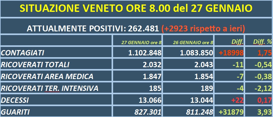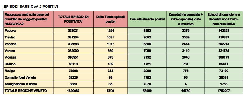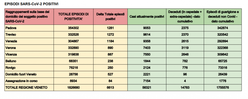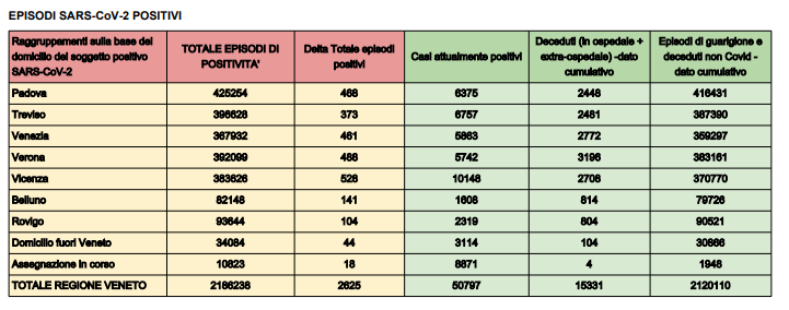 Numeri ancora in calo per quanto riguarda la pandemia da Covid-19 in Veneto. Scendono a 2.625 i positivi riscontrati in Veneto, con la sola Vicenza sopra ai 500 casi.