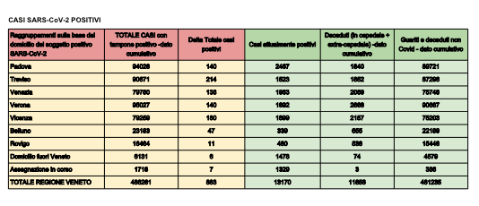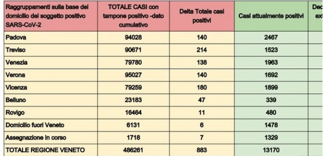 Il Covid avanza in Veneto: salgono ancora i contagi con 883 nuovi positivi nelle ultime 24 ore. Così come le vittime che sono 7 nelle ultime 24 ore. I ricoverati in area non critica sono 261 (+4), quelli in terapia intensiva 58 (+6). Prima per contagi Treviso, con 214, a seguire Vicenza con 180, a Padova e Verona 140 ciascuna, a Venezia 138, chiudono Belluno con 47 casi e a Rovigo 11.