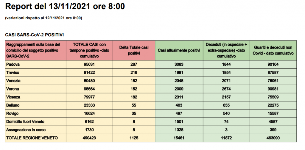 Terzo giorno consecutivo per la regione Veneto con più di 1000 contagiati: 1125 il totale delle ultime 24 ore. Padova la città più colpita, con quasi 300 casi in più (287); seguono Treviso (216), Venezia (182), Vicenza (182), Verona (152), Belluno (55) e Rovigo (35). Padova è anche la città con più casi attivi in assoluto: superate le 3000 unità.