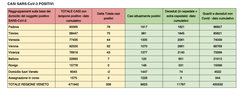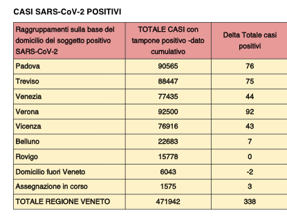 Covid Veneto, + 338 positivi, 1 vittima. Nessun nuovo contagio a Rovigo
