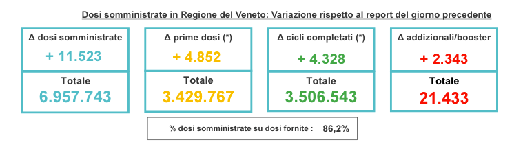 Covid in Veneto, il bollettino di oggi: sono 338 i nuovi contagi nelle ultime 24 ore. In ordine: Verona con 92 positivi, Padova con 76, Treviso con 75, Venezia con 44, Vicenza con 43, Belluno con 7 mentre a Rovigo non c’è stato alcun nuovo positivo. Una vittima nelle ultime 24 ore. Sono infine 9.623 le persone attualmente in isolamento.