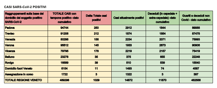 Per il secondo giorno consecutivo il Veneto supera 1000 nuovi contagi nelle ultime 24 ore, mentre sono 6 le vittime. Gli attualmente positivi e sono 14.872, 648 in più rispetto a ieri e crescono i ricoveri, con 285 pazienti nei reparti ordinari (+21) e 60 (+1) nelle terapie intensive. Al primo posto per numero di contagi resta la provincia di Padova, segue Treviso con 212,  Venezia con 156, Vicenza con 178, Verona 145 a Rovigo, con 39 casi e Belluno, con 35.