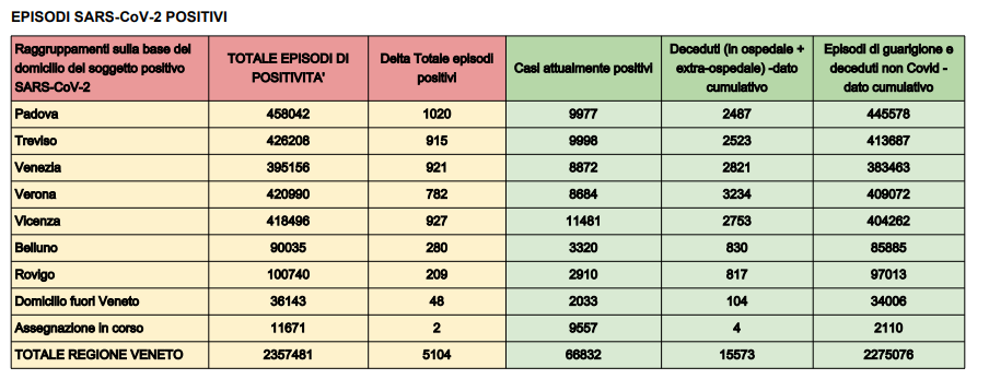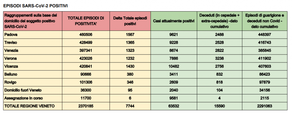 Dopo il calo del lunedì, tornano a salire, e di molto, i casi da Covid-19: 7.744 nelle ultime 24 ore. Padova la città più colpita con 1.567, seguita da Vicenza con 1.430. Più di 1000 casi anche a Venezia, Treviso e Verona. Vicenza è ancora la città con più positivi, sopra i 10 mila.