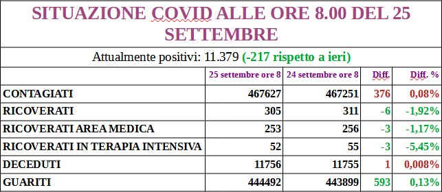 Sono 376 i nuovi positivi, ma continuano a calare i ricoverati: sono 305 adesso (6 in meno rispetto a 24 ore fa), di cui 253 in area medica (-3) e 52 in terapia intensiva (-3).