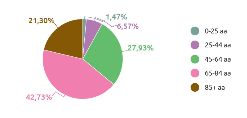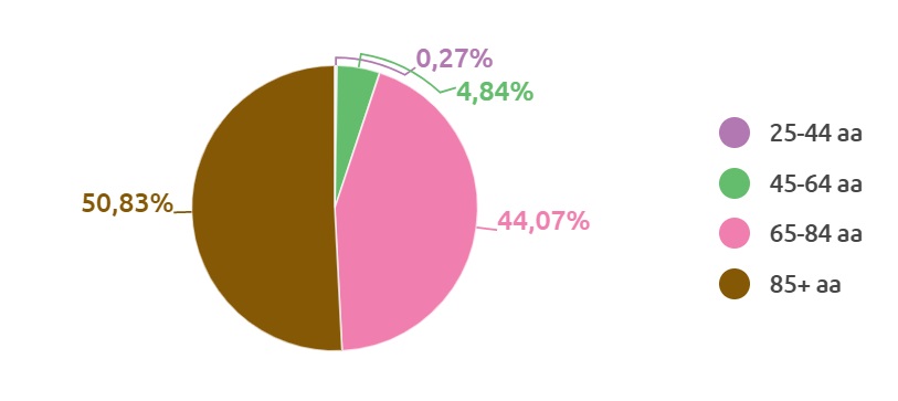Come si può notare il virus colpisce indifferentemente donne e uomini con leggera prevalenza delle donne. La mortalità è analoga per donne e uomini. I ricoverati sono in prevalenza uomini. Il 95% dei deceduti ha più di 64 anni. Lo 0,27% ha meno di 44 anni.