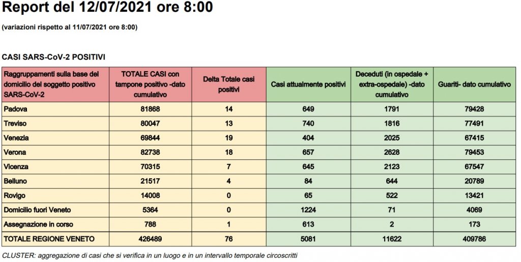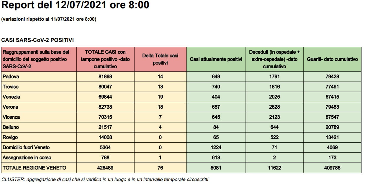 Ecco l’aggiornamento quotidiano della Regione Veneto. Rispetto a ieri sono 76 i nuovi contagiati