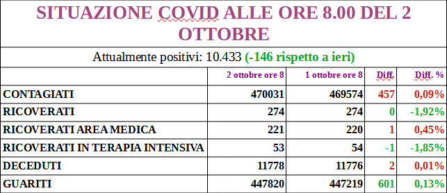 Continuano a calare i positivi: ora sono 10.433, 146 in meno rispetto alle 8 dell’1 ottobre.