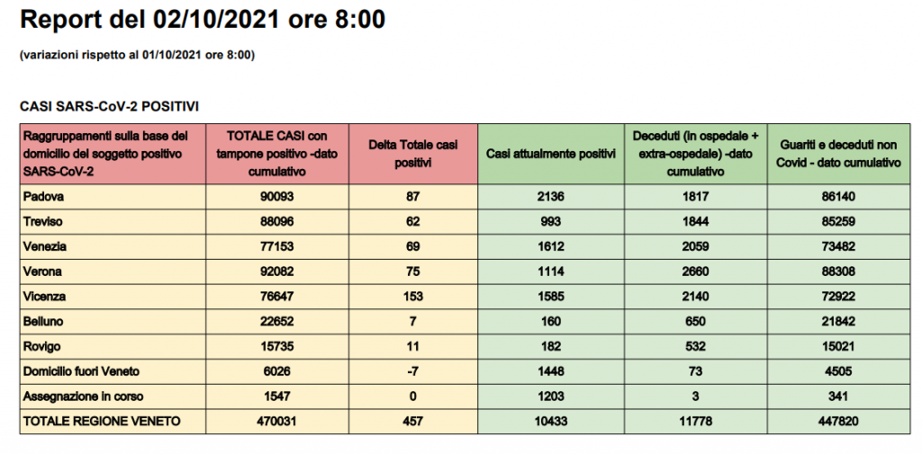 La Regione Veneto ha reso noti i dati relativi ai contagi da Covid-19 nelle ultime 24 ore.