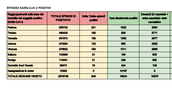 COVID VENETO – I contagi risalgono: 945 nuovi casi e 12 vittime