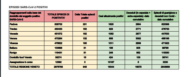Risalgono gli indici relativi al Covid-19 in Veneto, che nella giornata di ieri registra 945 nuovi casi e 12 morti; i totali sono rispettivamente di 2.676.788 contagi e 16.575 vittime.