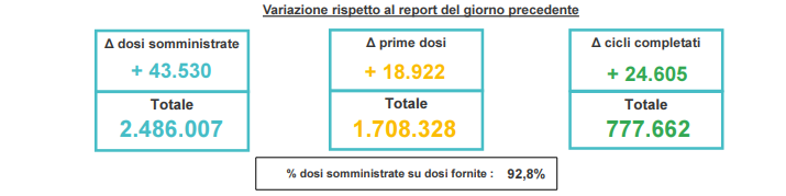 Di seguito i dati relativi ai vaccini somministrati ieri in Veneto. Più di 750 mila veneti hanno completato il ciclo, le dosi somministrate in totale sono quasi due milioni e mezzo.
