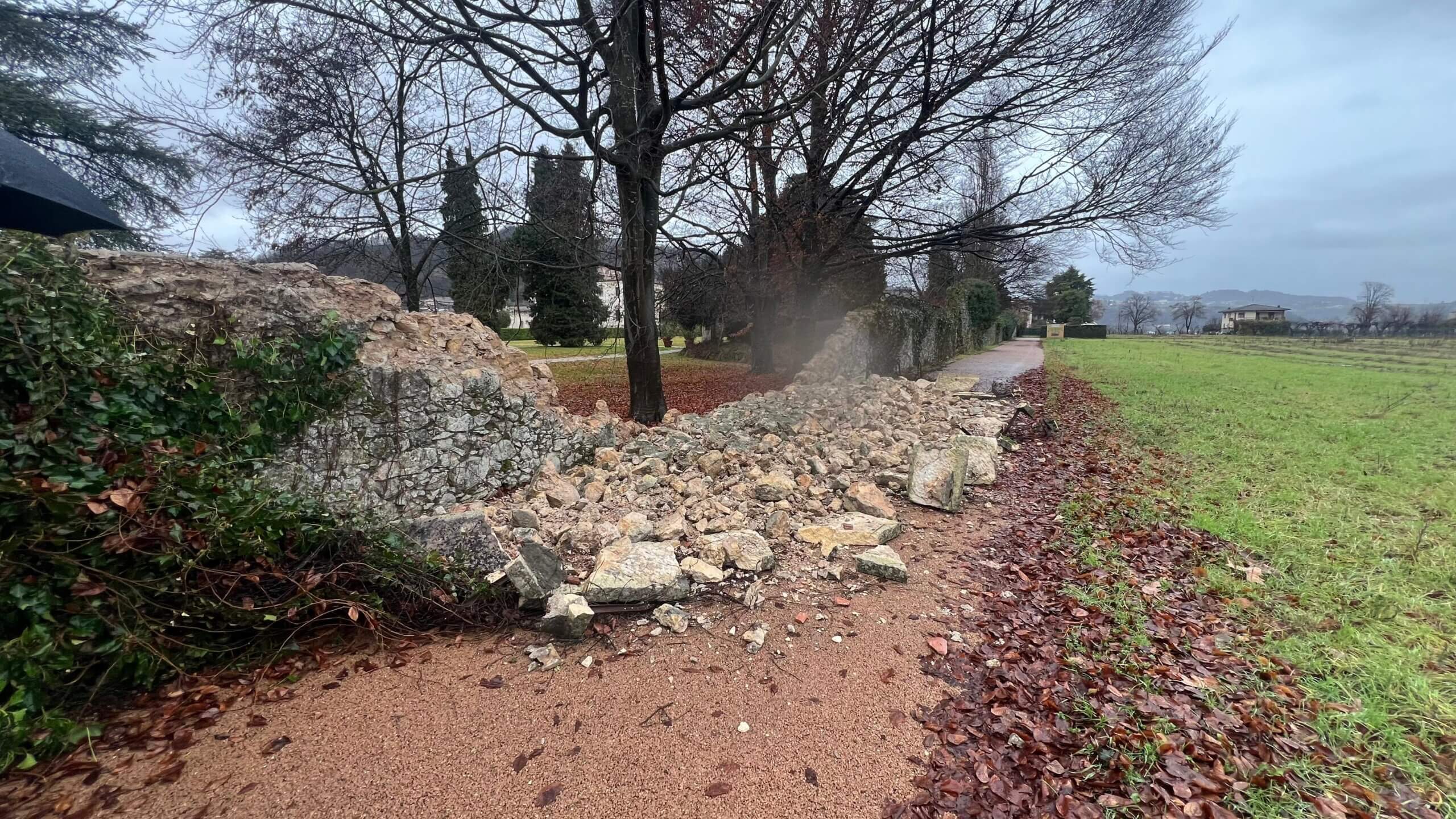 Montecchio Maggiore, 4 febbraio 2026 – Questa mattina una porzione della muratura in sasso che delimita il parco di Villa Cordellina Lombardi, storica sede di rappresentanza della Provincia di Vicenza, è crollata lungo il tratto che costeggia la pista ciclabile.