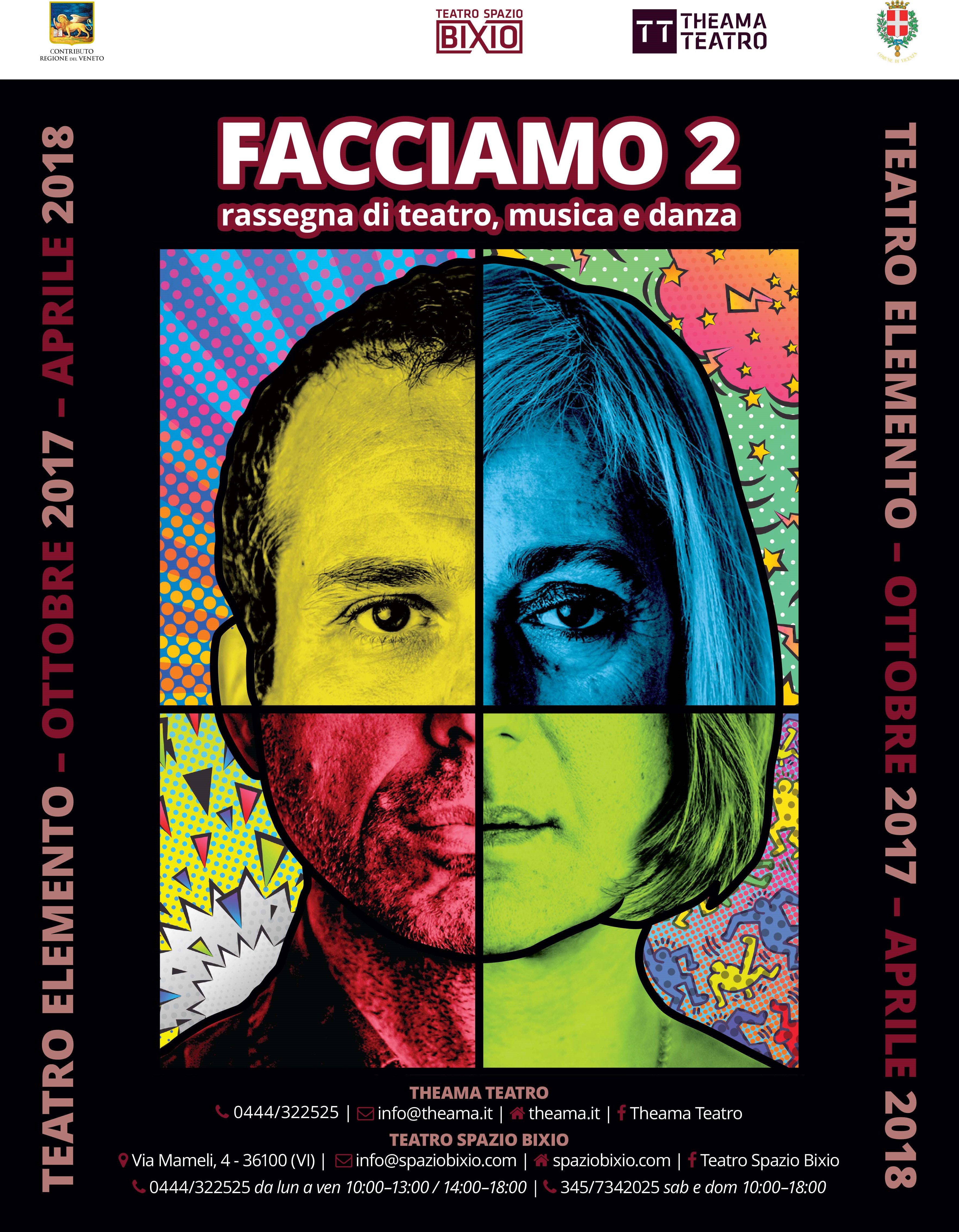 Impostazione “POP” nell’accezione più musicale del termine. Questo è il fil rouge che collega tutti gli eventi della proposta della nuova Rassegna 2017-2018 del Teatro Spazio Bixio, nel solco della tradizione ed in continuità con quanto già tracciato con la precedente stagione, ma con un’anima passionale. I temi dell’amore e della libertà, della difesa della propria identità, dell’accoglienza dell’altro diventano spunti di riflessione sull’uomo, sulla coppia, sull’amore, sulle paure dell’ignoto e al tempo stesso del riscatto attraverso le gioie della vita più passionali ed incontrollabili. Un teatro che rispecchia la contemporaneità attraverso una visione inconsueta: con la dissacrazione di molti luoghi comuni e la demolizione di alcuni punti fermi. Sono questi gli elementi di FACCIAMO 2, la nuova stagione 2017-2018 di Teatro Elemento, la rassegna curata e promossa da Theama Teatro per il Comune di Vicenza, con il contributo della Regione del Veneto e Banca San Giorgio Quinto Valle Agno, giunta alla sua dodicesima edizione. Un appuntamento che, nel corso di questi anni, ha acquisito sempre maggior rilevanza sia entro la comunità cittadina che fra le iniziative nazionali, offrendo al territorio momenti di scambio, conoscenza, cultura e intrattenimento. Questa l’essenza di questa nuova stagione teatrale, al debutto sabato presso il Teatro Spazio Bixio alle ore 21. Una proposta ampia e varia, con diversi debutti assoluti, dalla commedia al recital dalla danza alla musica. Un mix suggestivo di tradizione, storie, personaggi e temi contemporanei. Ciliegina sulla torta, due iniziative denominate EVENTI SPECIALI, che connotano ancora di più la funzione del teatro Spazio Bixio come un luogo di massima accoglienza delle proposte culturali. Al via quindi sabato 28 ottobre alle ore 21.00 con un debutto in co-produzione tra due realtà vicentine, Teatro Safarà + Theama Teatro, “Sognando la Mérica in pausa caffè” una storia di emigrazione veneta che risale all’ottocento, in una visione al tempo stesso classica ed ironica. Nel mese di novembre si prosegue con tre spettacoli, dai veronesi Teatro Impiria con “Ali”, ai vicentini Exvuoto Teatro con “Sister’s”, passando per il recital musicale in omaggio al Teatro Canzone di Giorgio Gaber, “Piano Gaber” dei milanesi Lo Strano Caso. Dicembre inizierà ricordando la giornata contro la violenza sulle donne, in una performance dei romani Lineadiconfine. “Amami quanto io t’amo”, la storia di Marguerite Gautier, la Signora delle Camelie, sguardo lucido sulle virtù e le miserie del genere umano. Contestualmente verrà tenuto il Seminario di Bioenergia da parte dell’attrice Paola Negrin. L’evento speciale dedicato a Vincent Van Gogh, visto attraverso l’interessantissima opera della cognata Johanna Bonger, moglie del fratello del pittore Theo, ci aiuterà poi a far luce sulla personalità di questa incredibile e geniale figura dell’impressionismo. L’anno si conclude con l’originale e divertente performance sul tema dell’immigrazione “Smile at Strangers”, con i veronesi Niki Neve e la sua Banda. Il 2018 si apre con un’altra realtà vicentina, Gli Scavalcamontagne, alle prese con “Grimilde 2018”, una strega di Biancaneve proiettata nell’epoca dei social network. A seguire un’ originalissimo approccio alla diversità con la bresciana Jessica Leonello ed il suo “Nuovo Eden”. Gennaio si chiude con due spettacoli nell’ultimo week end, con Ugo Brusaporco che in “Non come tutte”, in occasione della Giornata della Memoria, da’ voce alla madre di un attentatore suicida, e Theama teatro che presenta un progetto scritto in collaborazione con la scrittrice Cecilia Resio, “Cecilia nelle città”. A febbraio la commedia brillante di Neil Simon “A piedi nudi nel parco” verrà portata in scena dal sodalizio thienese Le circostanze date, seguito da un omaggio a Bob Dylan firmato da Ensemble Vicenza Teatro. 16 17 e 18 febbraio una full-immersion dedicata all’improvvisazione con l’attrice Valentina Brusaferro, protagonista sabato 17 anche nella performance Pop “Folle amore”, con Matteo Cremon e Igi Meggiorin. Altra commemorazione musicale in omaggio ai Beatles, con Alice Testa e Riccardo Bertuzzi, in occasione del cinquantennale dell’uscita dell’album Sergent’s Pepper l.h.c.b. per chiudere il mese di febbraio. A marzo apertura all’insegna dell’ironia caustica con la romana Giada Prandi in “Scritto apposta per me” di Aldo Nicolaj, a seguire la brillante e scoppiettante commedia “La Presidentessa” di Nautilus Cantiere Teatrale ed il seminario sulla comicità con Diego Carli, performer di Jashgavronsky Brothers. Breve divagazione nella passione con lo spettacolo di danza flamenca “Colores del Alma”, per tornare all’ironia con Jim Entertainment in “Faac – fagheli anca a casa”. Il mese si chiude con l’ennesimo omaggio musicale, questa volta ad un grande autore come Herbert Pagani, nell’evento “Herbert Pagani è stato anche qui” di Theama Teatro in collaborazione con DNA. Ad aprile ritorno di Valentina Brusaferro con “Puer Aeternus” ed un altro ironico appuntamento con un’autrice ed attrice vicentina, Silvia Boeche ed il suo “Giulietta è caduta dal balcone”. Evento speciale fuori rassegna per la chiusura, con Theama Teatro ed un omaggio allo scrittore vicentino Saverio Mirijello.