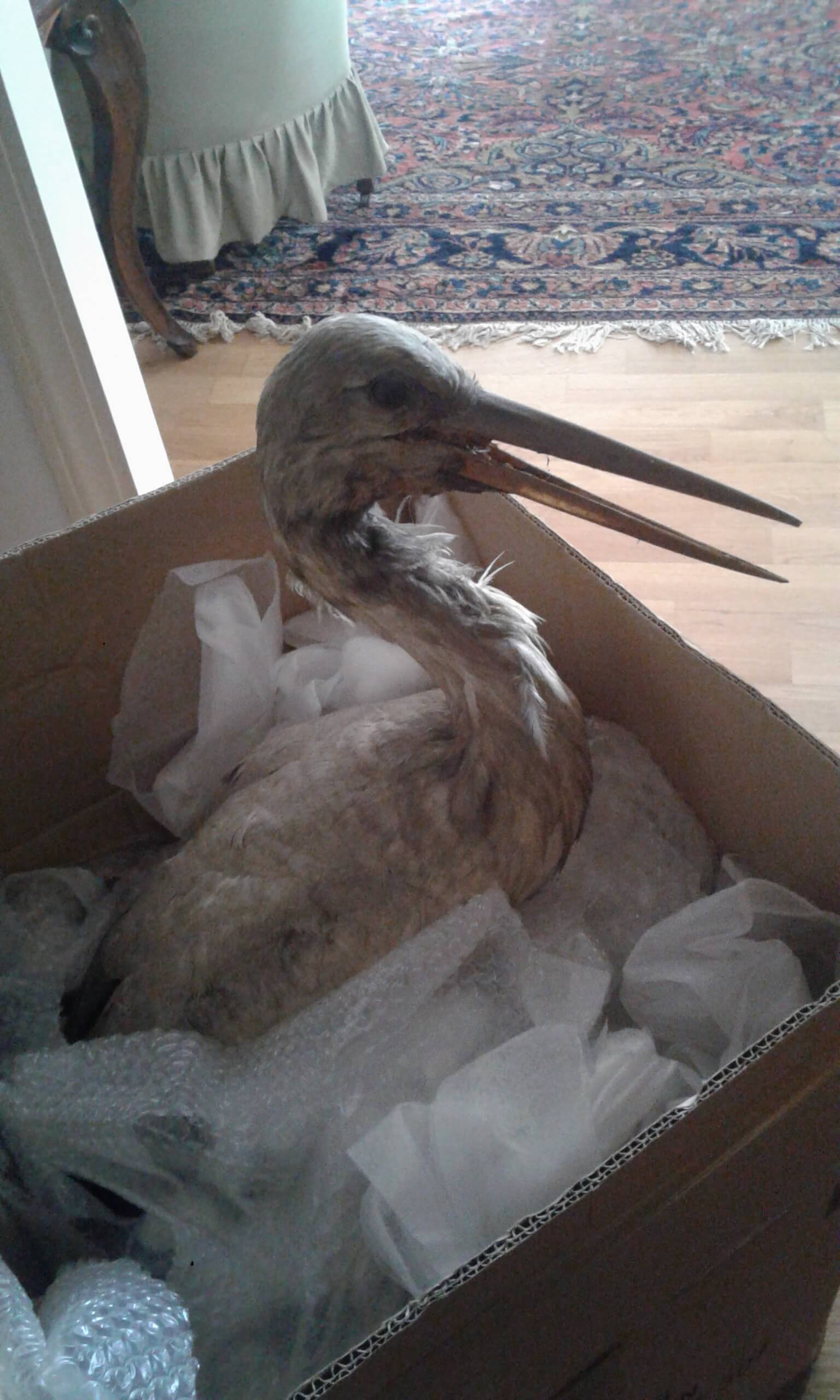La cicogna, regalata in occasione della nascita della donatrice nel 1939, negli anni ha seguito diversi spostamenti della famiglia in Italia, prima di accasarsi a Vicenza e ora a Montecchio Maggiore, grazie all’intermediazione di Antonio Dal Lago, già conservatore del Museo Naturalistico Archeologico di Vicenza, a cui Alessandra da Conturbia si era inizialmente rivolta per trovare una sede in cui esporre l’animale.