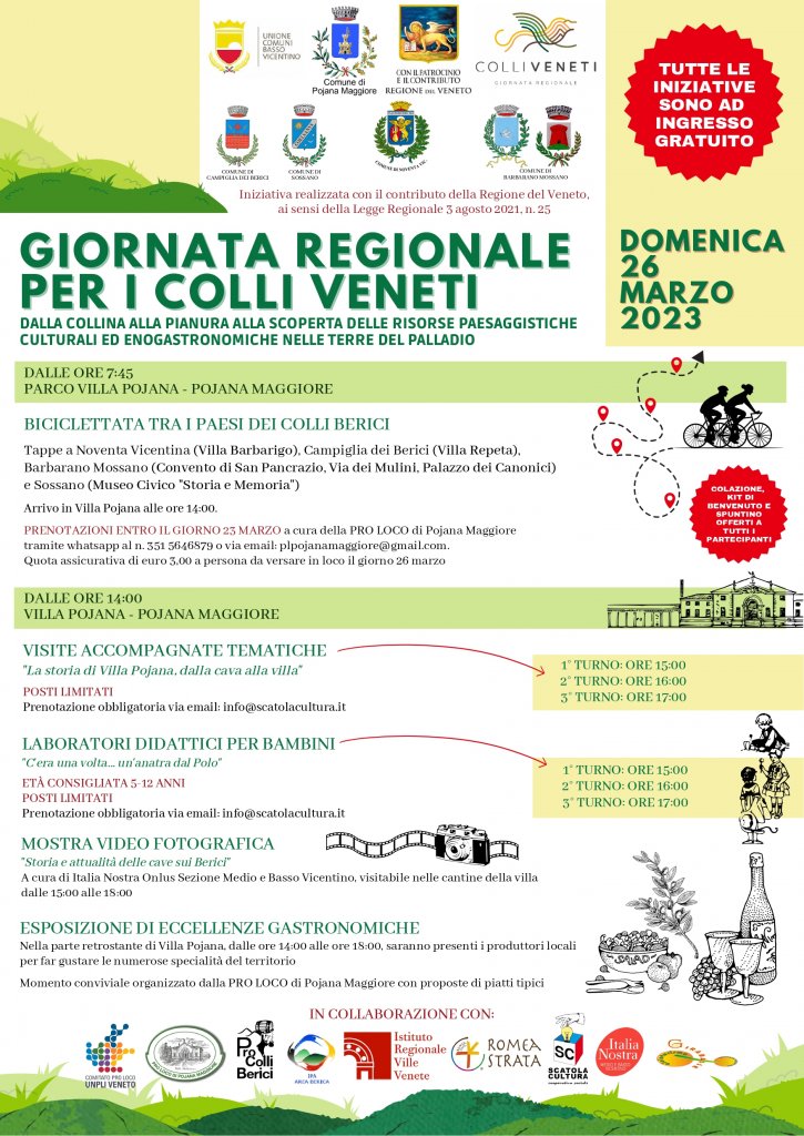Importante appuntamento domenica 26 marzo con la Giornata Regionale per i Colli Veneti, che nell’area Berica vede coinvolte molte municipalità. La giornata è organizzata con il contributo della Regione del Veneto. Il titolo di questa edizione è: DALLA COLLINA ALLA PIANURA ALLA SCOPERTA DELLE RISORSE PAESAGGISTICHE CULTURALI ED ENOGASTRONOMICHE NELLE TERRE DEL PALLADIO.