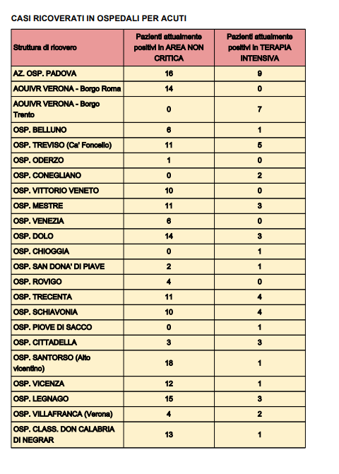 La Regione Veneto ha pubblicato i dati relativi ai contagiati da Covid 19 nelle ultime 24 ore. Sono ben 13 le persone in più ospedalizzate rispetto a domenica alla stessa ora: 9 in area medica, 4 in terapia intensiva.