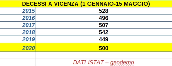 In questa tabella riportiamo i dati Istat relativi al Comune di Vicenza, indicanti il numero dei decessi da inizio anno al 15 maggio 2020. Si nota subito un netto aumento nel 2020 rispetto al 2019 (+51 morti). Nel 2019 vi fu, peraltro, un netto calo rispetto al 2018. Nel complesso il dato è analogo (ma inferiore) al 2017, analogo (ma superiore) rispetto al 2016 e nettamente inferiore al 2015 e al 2018.