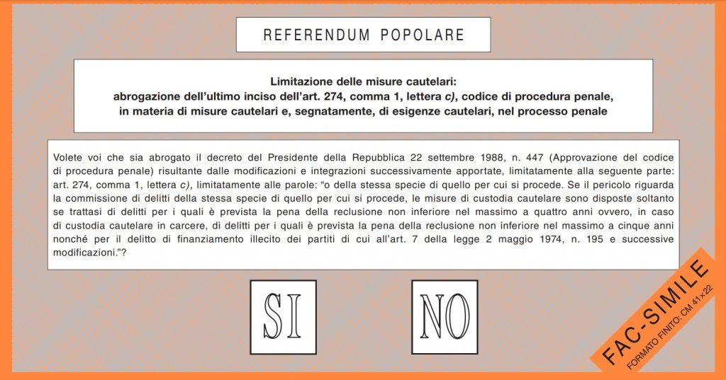 - scheda di colore arancione per il referendum n. 2: limitazione delle misure cautelari: abrogazione dell’ultimo inciso dell’art. 274, comma 1, lettera c), codice di procedura penale, in materia di misure cautelari e, segnatamente, di esigenze cautelari, nel processo penale;