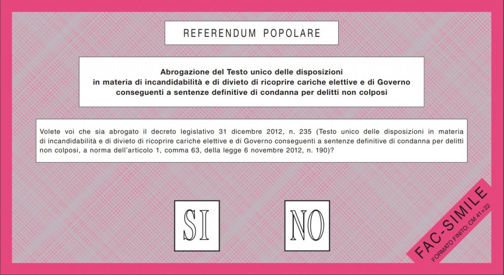 - scheda di colore rosso per il Referendum n. 1: abrogazione del Testo unico delle disposizioni in materia di incandidabilità e di divieto di ricoprire cariche elettive e di Governo conseguenti a sentenze definitive di condanna per delitti non colposi;