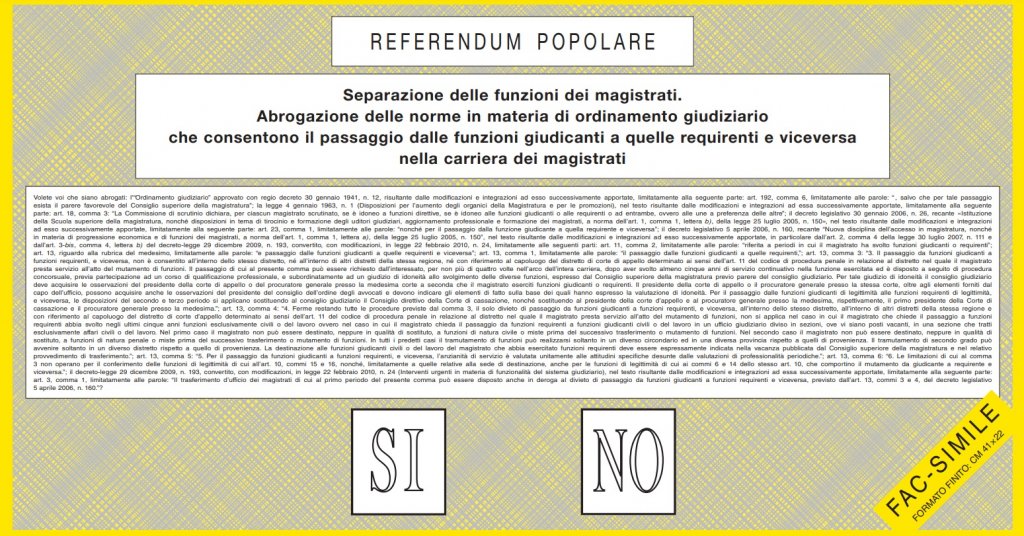 - scheda di colore giallo per il referendum n. 3: separazione delle funzioni dei magistrati. Abrogazione delle norme in materia di ordinamento giudiziario che consentono il passaggio dalle funzioni giudicanti a quelle requirenti e viceversa nella carriera dei magistrati;