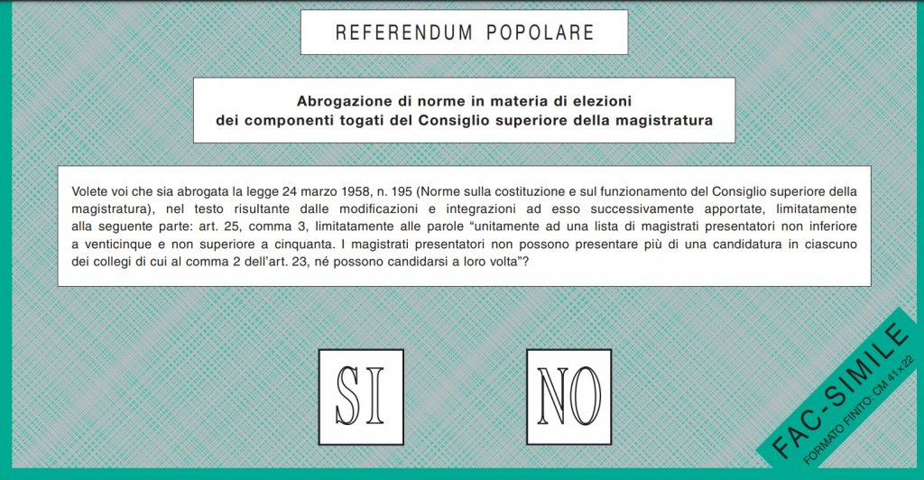 - scheda di colore verde per il Referendum n. 5: abrogazione di norme in materia di elezioni dei componenti togati del Consiglio superiore della magistratura.
