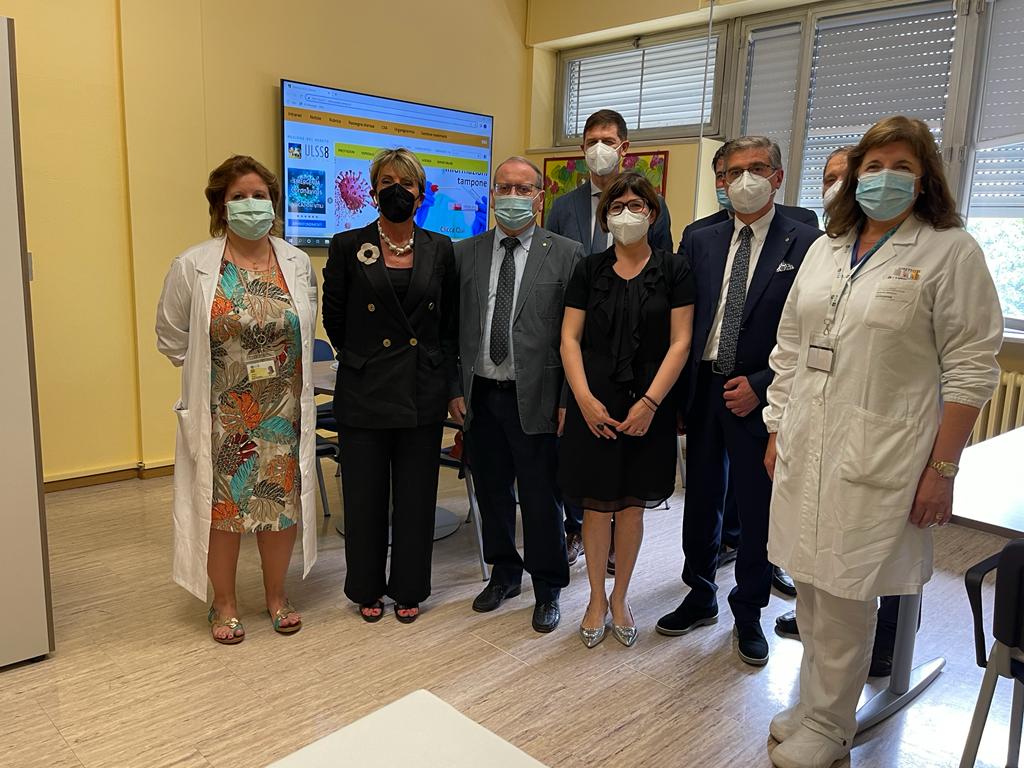 Si è tenuto questa mattina un breve momento di ringraziamento per la donazione degli apparecchi televisivi alla presenza del direttore generale ULSS 8 Berica dott.ssa Maria Giuseppina Bonavina, del direttore medico dott.ssa Romina Cazzaro, del direttore medico Noventa Vicentina dott.ssa Michela Muriago, del Presidente BCC Vicentino Pojana Maggiore Giancarlo Bersan con il vice presidente Moreno Fortuna e con altri consiglieri BCC, e con il vice direttore generale BCC Vicentino Maurizio Pellizzari.