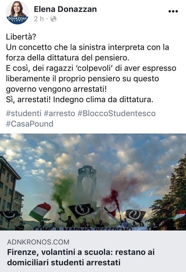 Ancora censurata Elena Donazzan, Assessore regionale del Veneto ed esponente del partito di Giorgia Meloni da parte di Facebook a causa di un post. A distanza di poco più di un anno dall’oscuramento di alcuni post legati alla sua partecipazione ad un convegno organizzato da Casapound, a causare stavolta la dura stigmatizzazione di Facebook è stato un commento pubblicato ieri (16/12/2020) in merito alla notizia della convalida dell’arresto degli studenti fiorentini legati al movimento studentesco di destra Blocco Studentesco all’esito di un volantinaggio, invocando la libertà di manifestazione del pensiero