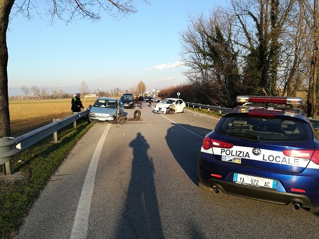Incidente a Dueville domenica 21 gennaio poco prima delle 15. In base alla ricostruzione della Polizia Locale Nord Est Vicentino, un’Alfa Romeo Giulietta percorreva la S.P. Marosticana proveniente da Vicenza con direzione Dueville condotto da B.G. classe 1936 residente a Vicenza. Giunto in località Trescalini nell’affrontare, un tratto di strada in curva a visuale libera ha perso il controllo del veicolo e ha invaso la corsia opposta di marcia andando a collidere semi frontalmente contro l’autovettura Fiat Punto proveniente dall’opposta direzione di marcia condotta da M.M. classe 1970 residente a Dueville. Entrambi i conducenti sono stati soccorsi dal SUEM di Vicenza rispettivamente in codice giallo e verde. A bordo di entrambe le autovetture vi erano anche due passeggeri che rimanevano illesi. Sul posto intervenivano 3 pattuglie del Consorzio Polizia Locale Nordest Vicentino per i rilievi e per la viabilità. La S.P. 248 è rimasta totalmente chiusa per 2 ore.