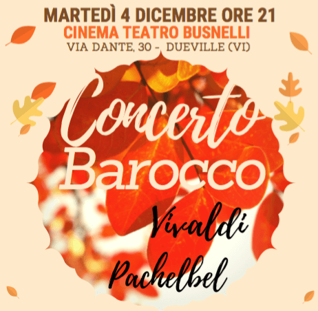 Il Concerto Barocco dell’Orchestra 3 Quarti Ensemble Giovanile presenterà opere di Vivaldi e Pachelbel e sarà guidato dal maestro con concertatore Giuseppe Valtinoni, dai maestri preparatori Giuseppe valtinoni ed Alessandra cibien, che coordineranno i solisti: Giuseppe Valtinoni e Rossella Castaman ai violini, Filippo Pigato al violoncello. L’Orchestra avrà quale maestro preparatore del coro: Elisa Salbego, coordinatore artistico: G. Nevio Zanivan ed il coordinamento tecnico sarà curato da: Dedalofurioso.