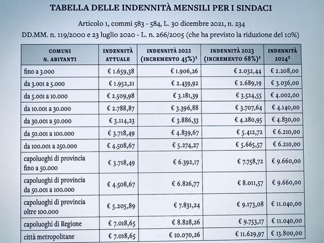 In realtà non si tratta di una novità, bensì dell’andata a regime di una norma inserita senza tanti clamori dal Governo Draghi nella Legge di Bilancio del 2022, che prevede che l’indennità di Sindaco, nelle Regioni a Statuto ordinario, sia parametrata a quella del Presidente di Regione (circa 13.800 euro), e proporzionale al numero dei residenti (differenziandola anche in base al fatto se si tratti di città metropolitana, capoluogo di Regione o di Provincia).
