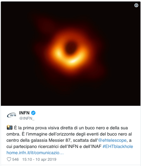 Per la prima volta è stato fotografato un buco nero. Dopo che nel 2016 le onde gravitazionali hanno dimostrato l’esistenza di questi misteriosi oggetti cosmici, arriva la prima prova diretta e l’immagine che lo testimonia è quella del buco nero M 87, al centro della galassia Virgo A (o M87), distante circa 55 milioni di anni luce. Al risultato, del progetto internazionale Event Horizon Telescope (Eht), l’Italia ha partecipato con Istituto Nazionale di Astrofisica (Inaf) e Istituto Nazionale di Fisica Nucleare (Infn).