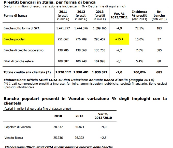 Infine, tra le 10 realtà che entro 18 mesi dovranno adeguarsi alle nuove regole introdotte ieri dalla Presidenza del Consiglio dei Ministri, ci sono anche due Popolari venete: Veneto Banca e la Popolare di Vicenza. In questi ultimi anni (2010-2013) anche loro hanno incrementato il volume dei prestiti. Se per la prima l’aumento è stato del 2,5 per cento, per la seconda la crescita è stata addirittura del 9 per cento.