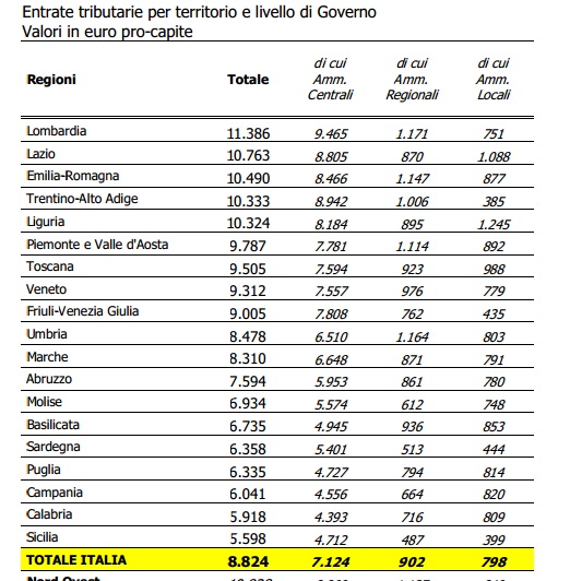 Ogni residente in Lombardia corrisponde all’Erario e ai vari livelli di governo locali mediamente 11.386 euro. Seguono i residenti del Lazio, con 10.763 euro e quelli emiliano-romagnoli, con 10.490 euro. Appena fuori dal podio troviamo i residenti nel Trentino Alto Adige, con 10.333 euro pro capite e quelli della Liguria, con 10.324 euro pro capite. Chiudono la classifica i campani, con 6.041 euro pro capite, i calabresi, con 5.918 euro pro capite e, infine, i siciliani, con 5.598 euro pro capite. La media nazionale si attesta sugli 8.824 euro per abitante. A livello di macroaree, primeggia il Nordovest (10.828 euro), seguito dal Centro (9.868 euro) e dal Nordest (9.819 euro); chiude, molto staccato, il Sud, con 6.137 euro pro capite.