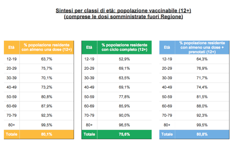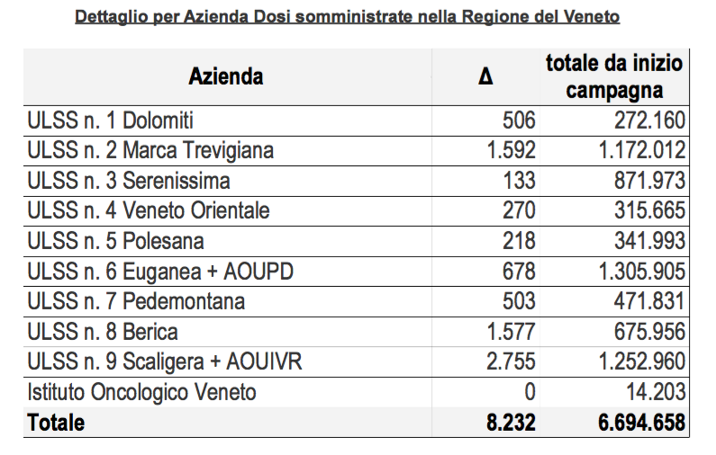 Sono 3.308.512 i residenti in Veneto ad aver completato le due dosi di vaccino anti-Covid, pari al 68,2%. Lo riporta il bollettino regionale che rileva come almeno una dose è stata inoculata a 3.503.643 persone (72,2%). Ieri sono state somministrate ben 8.232 dosi (di cui 2.910 prime dosi) che portano il totale delle iniezioni a 6.694.569. Le forniture utilizzate sono l’89,6% dei vaccini giunti in regione.