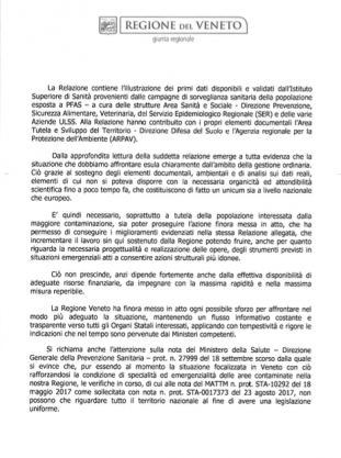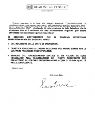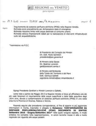 Con una propria lettera, inviata in data 19 settembre 2017 al Presidente del Consiglio Paolo Gentiloni e ai Ministri della Salute Beatrice Lorenzin, e dell’Ambiente Gianluca Galletti,(il giorno successivo alla nota del Dipartimento Prevenzione del Ministero della Salute che respingeva la richiesta della Regione Veneto di fissare limiti nazionali per l’inquinamento da sostanze perfluoro alchiliche) il Presidente della Regione Veneto Luca Zaia aveva chiesto formalmente la deliberazione dello Stato di Emergenza, con poteri che implicano la gestione della situazione in forma commissariale, aveva ribadito la richiesta di riduzione dei limiti a livello nazionale, e chiesto lo sblocco dei fondi statali (80 milioni) necessari alla realizzazione di nuovi acquedotti che permettano di portare acqua di buona qualità nelle zone colpite. L’importante documento è stato reso noto oggi dallo stesso Governatore, all’indomani della decisione assunta, in totale autonomia, di ridurre i limiti di presenza dei Pfas nelle acque potabili del Veneto. Nella lettera, il Presidente fa riferimento al “Documento di Sintesi Settembre 2016 – Giugno/Settembre 2017” sulla “Contaminazione da Sostanze Perfluoro Alchiliche”, dal quale risulta di tutta evidenza “che la situazione che si è delineata dai dati recentemente acquisiti, può essere affrontata solo con mezzi e poteri straordinari”.