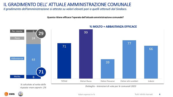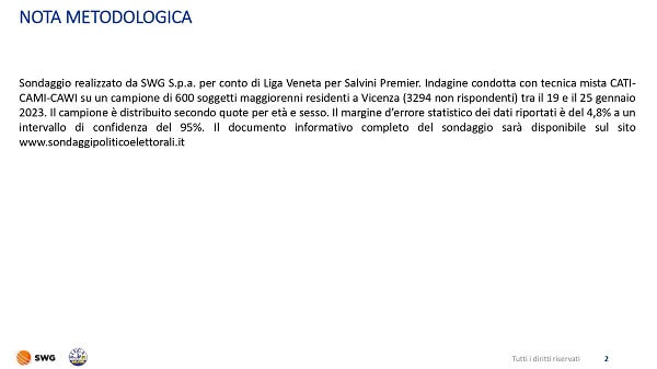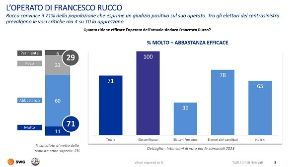 “Il 71% dei cittadini vicentini promuove il lavoro fatto in questi ultimi 5 anni dal Sindaco Rucco -recita il comunicato della Lega – e dalla sua Amministrazione di cambiamento e rilancio della città. E’ il primo dei dati molto significativi che emergono dalla ricerca di opinione realizzata da SWG per la Lega sulla città di Vicenza tra il 19 e il 25 gennaio. Meno del 30% dei vicentini invece non è favorevole all’operato di Rucco e della sua attuale squadra. E il dato ulteriormente indicativo è che questo giudizio sia esattamente identico tra il Sindaco Rucco e i suoi Assessori, a dimostrazione di una perfetta identità e unitarietà sia della squadra che dell’intera maggioranza. E ancora molto chiara anche la decisa prevalenza dei giudizi positivi per il Sindaco Rucco e per l’Amministrazione tra gli elettori dei candidati diversi da Rucco e dal candidato del PD. E la medesima positività si ritrova tra gli elettori indecisi su cosa votare.