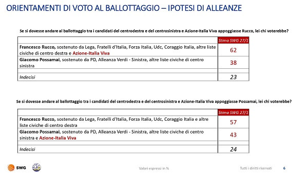 Questo giudizio così nettamente positivo in città su questi 5 anni di lavoro del Sindaco e del centrodestra si ritrova con chiarezza nelle intenzioni di voto che indicano al primo turno un’ampia distanza tra il candidato civico e di centrodestra Rucco e il candidato del PD fino a poter anche ipotizzare una possibile vittoria al primo turno del centrodestra, con un 51% contro un 34%. E all’eventuale ballottaggio con qualsiasi alleanza possibile rispetto al terzo polo la vittoria oggi nelle intenzioni di voto dei vicentini sarebbe molto larga per Rucco e per il centrodestra civico che guida, con il 57% nel caso il terzo polo si alleasse con il candidato del PD e della sinistra e con il 62% nell’ipotesi di una alleanza invece del terzo polo con Rucco. Un segnale di cosa preferirebbero chiaramente gli elettori del terzo polo, a prescindere dalle scelte che potrebbero essere imposte da Roma.