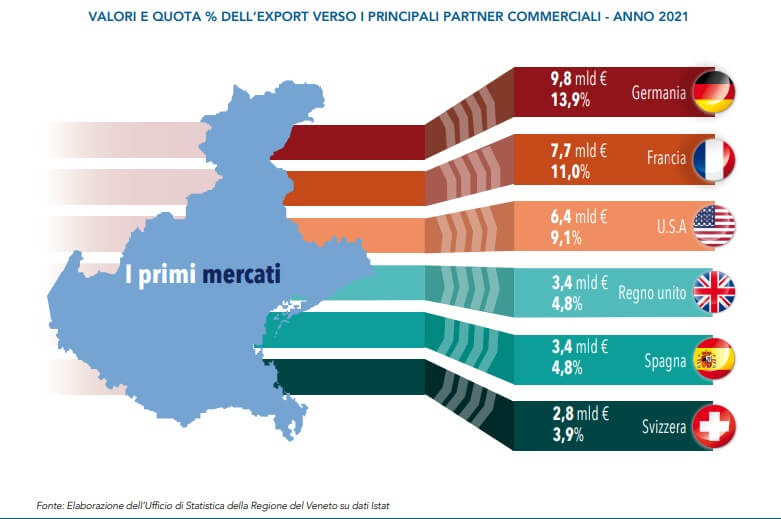Nel 2021 i principali mercati di destinazione per le merci venete sono quelli della UE, +20% su base annua e +11,3% se confrontato col dato del 2019, a cui è ascrivibile oltre il 57% del valore complessivo dei prodotti locali esportati. Il mercato tedesco resta il primo polo in assoluto delle nostre vendite estere, un mercato che pesa quasi il 14% dell’intero export regionale e che rimane fortemente interconnesso con quello veneto nella produzione di diversi settori industriali. Il valore dell’export veneto verso il mercato tedesco supera i 9,7 miliardi di euro, registrando una crescita vicina al 17% sia su base annuale, sia se confrontata con i valori del 2019.