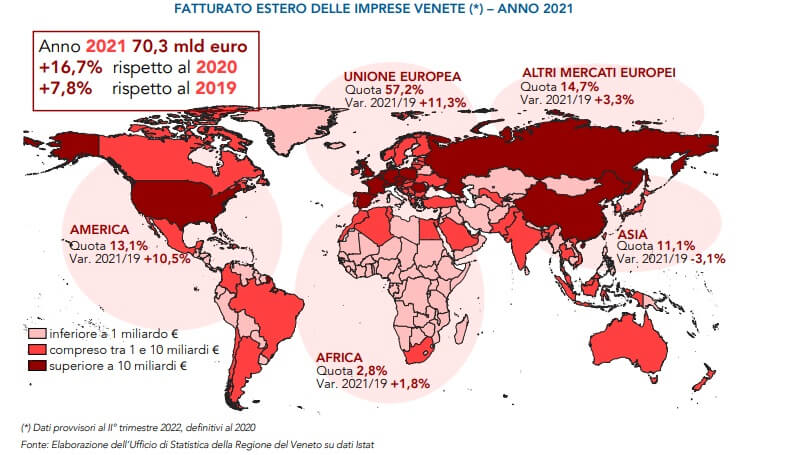 del commercio mondiale, dopo la caduta avvenuta nel 2020, dovuta alla drammatica diffusione della pandemia e alle conseguenti misure di contenimento adottate nei mesi centrali del 2020, le esportazioni venete raggiungono il loro massimo storico: nel 2021 le esportazioni regionali arrivano a 70,3 miliardi di euro e registrano un tasso di crescita (+16,7% rispetto al 2020) che consente anche il pieno recupero dei livelli pre pandemia (+7,8% rispetto al valore registrato nel 2019). Il Veneto si conferma la terza regione esportatrice, dietro a Lombardia ed Emilia Romagna, e in valore assoluto le esportazioni venete rappresentano il 13,6% di quelle nazionali. I segnali positivi per il fatturato estero delle imprese regionali