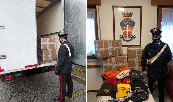 Si presentava con un furgone con targa contraffatta e con tanto di loghi delle principali aziende di spedizione sia sul furgone sia sulla divisa, oltre che con documenti contraffatti. Ritirava poi abiti di alta gamma e si dileguava