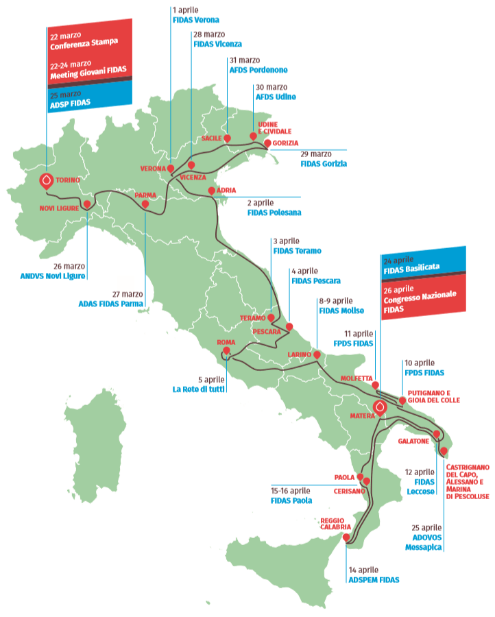 Venticinque tappe lungo tutto lo Stivale, partendo da Torino per arrivare a Matera. È il Fidas Tour 2019, che ha preso il via lunedì 24 marzo per concludersi venerdì 26 aprile, in concomitanza con l’apertura del 58° Congresso nazionale della Fidas.