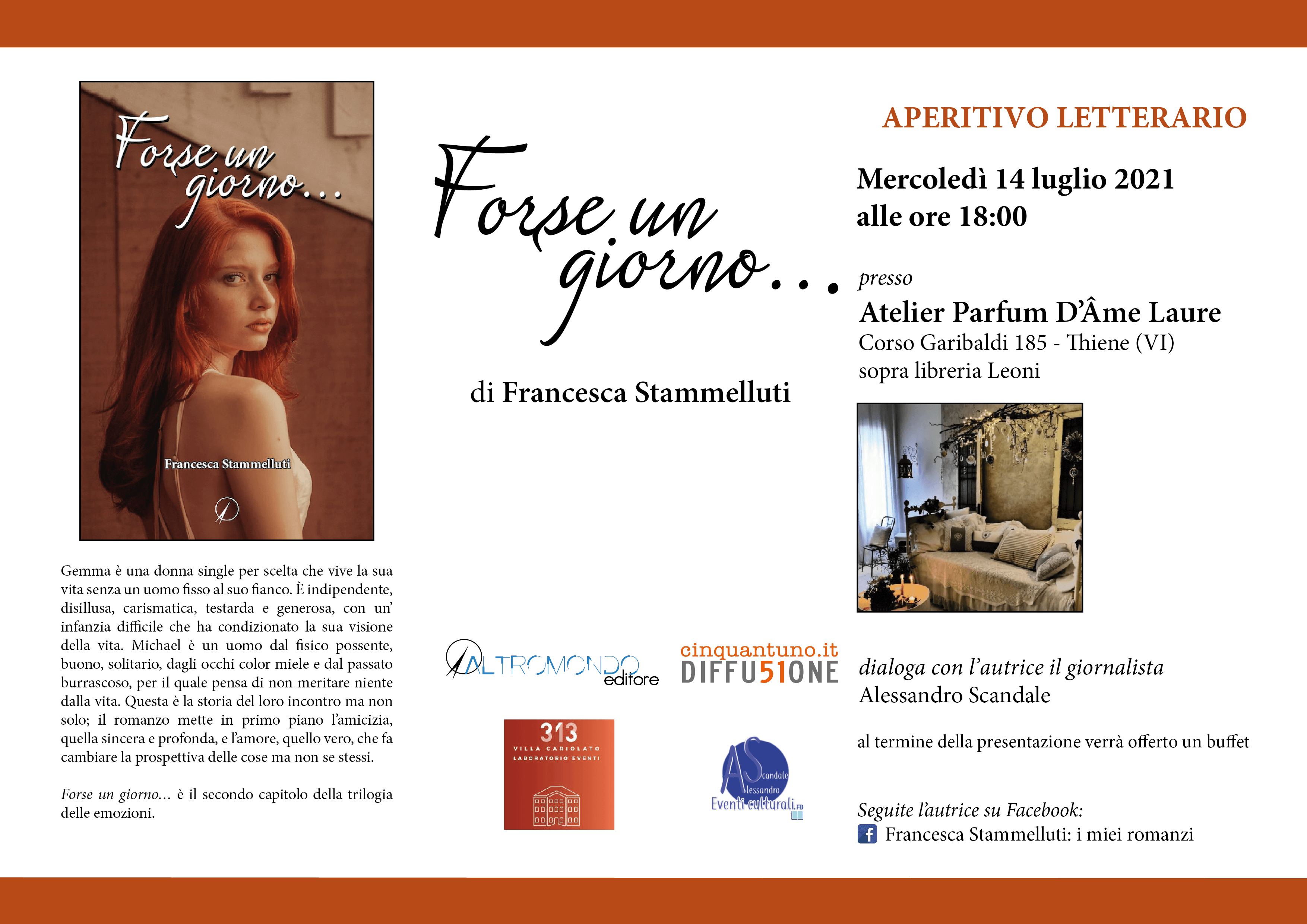 Mercoledì 14 luglio, a Thiene, all’Atelier Parfum D’Âme Laure di Thiene Francesca Stammelluti, scrittrice napoletana, presenterà il suo libro Forse un giorno…, secondo capitolo della trilogia delle emozioni. A dialogare con lei il giornalista Alessandro Scandale. Buffet al termine della presentazione.