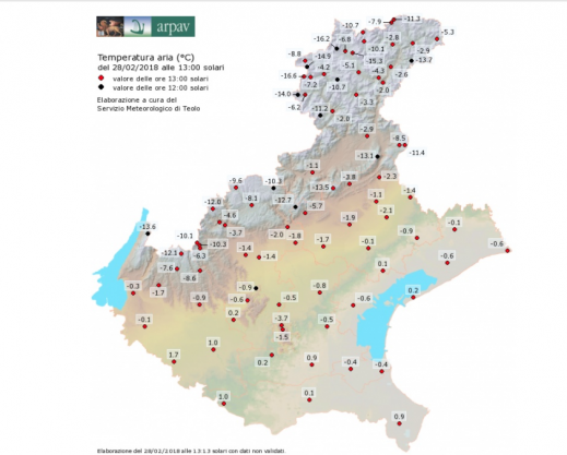 Tutta la Regione oggi si è svegliata sottozero. Come si evince dal resoconto Arpav, infatti, le temperature sono sotto lo zero termico praticamente in tutto il Veneto e continuano ad esserlo in tutta questa giornata polare. Tutte le città e i paesi dell’intera regione, infatti, oggi hanno a che fare con temperature glaciali. Quasi nessuna stazione di rilevamento dislocata sul territorio veneto ha fatto registrare un valore positivo. Considerando il mese di febbraio, che si chiude oggi, negli ultimi anni le ondate di freddo più intense, con valori minimi intorno ai –15 a 1500 metri di quota e inferiori ai –7 in pianura, si registrarono nelle prime due decadi del febbraio 2012 e tra la fine di febbraio e primi giorni di marzo del 2005, in quest’ultimo caso accompagnate da una diffusa nevicata fuori stagione in pianura il 3-4 marzo. Altre fasi altrettanto fredde nello stesso mese si registrarono nella seconda decade del febbraio 1994 e nella terza decade del febbraio 1993.