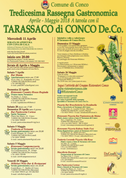 Ad aprile e maggio Comune e ristoratori Confcommercio celebrano quest’erba spontanea in piatti gourmet, aperitivi, dolci e non solo. E’ già tempo di tarassaco sulla montagna vicentina, in particolare a Conco, località diventata negli ultimi anni la patria gastronomica di questo straordinario prodotto della terra. Nel piccolo comune dell’Altopiano di Asiago, che conta poco più di duemila abitanti ed è situato a 800 metri di altitudine, c’è infatti il miglior clima per far crescere quest’erba spontanea, che qui si presenta particolarmente tenera e delicata, dal sapore amarognolo che sconfina verso il dolce. Insomma, un prodotto tutto da assaggiare, soprattutto perché ha dato vita ad una tradizione culinaria che vede il Tarassaco di Conco proposto dall’antipasto al dessert, come stuzzicheria da aperitivo e persino nei dolci. Per provarlo il momento migliore è proprio questo: tra qualche giorno, infatti, il Comune di Conco e i ristoratori Confcommercio del paese daranno il via alla rassegna enogastronomica “A Tavola con il Tarassaco di Conco”. L’aperitivo della manifestazione, nel vero senso della parola, sarà oggi dalle ore 17.00 con “L’Aperitarassaco” del Bar Mania di Fontanelle di Conco, che avrà una ulteriore variante sabato 28 aprile (dalle 17.00) e domenica 29 aprile (tutto il giorno), con lo “Spritz Tarassaco” proposto dal Bar pasticceria Cortese di Conco (dove si possono anche trovare dolci e biscotti al Tarassaco per tutto il periodo della rassegna). Il via ufficiale delle serate enogastronomiche sarà, invece, mercoledì 11 aprile alle ore 20.00 nella sala Don Girardi a Conco, con la cena di gala curata dai ristoratori di Conco. Sarà poi il momento delle singole serate proposte dai ristoratori aderenti all’iniziativa. Queste le date: domenica 22 aprile al ristorante Country House Rugiada di Conco; sabato 5 maggio alla Trattoria al Tornante di Conco e al ristorante Campomezzavia di Asiago; e infine venerdì 18 maggio al Milleluci Wine Bar & Restaurant di Rubbio di Conco. Fino a tutto maggio, poi, specialità al Tarassaco di Conco si potranno trovare anche nelle seguenti attività: restando a Conco, “da Maino”, al Rubens Stube Fest e in Macelleria Ronzani; spostandosi qualche chilometro dal paese, anche a “La Rondinella” a Tortima di Marostica e “Alla Rosa” di Lusiana, oltre alla già citata Pasticceria Cortese di Conco. Per chi però non vuole solo sedersi a tavola, ma vuole trasformare il proprio interesse per il Tarassaco di Conco in una coinvolgente esperienza, ecco altri due appuntamenti da non perdere: domenica 13 maggio un’uscita guidata a raccogliere erbe spontanee, con visita al parco Bioflower di Rubbio e chiusura con un gustoso picnic; oppure