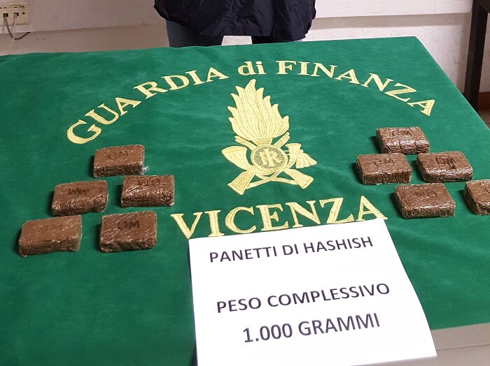 Veniva, pertanto, eseguita dai militari delle Fiamme Gialle, anche con l’ausilio di un’unità cinofila presente presso il Comando Provinciale di Vicenza, un’ispezione all’interno dell’abitacolo, dove – occultata sotto il sedile del guidatore – è stata rinvenuta una busta di plastica contenente dieci panetti di hashish da un etto ciascuno, per un peso complessivo di